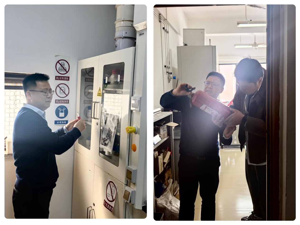 检查阶段,学院领导班子分赴各团队实验室,结合不同学科实验室特点开展针对性督查,重点围绕仪器设备规范使用、危险试剂管理、通风橱运行、消防器材配备等关键环节进行全面排查,仔细查阅安全台账、设备使用及试剂领用等相关记录。同时,现场核验实验人员安全操作规范及应急处置技能掌握情况,对排查发现的隐患问题当场指出、现场指导,明确整改要求与时限,实行“即时整改、跟踪销号”管理,构建全流程安全闭环。